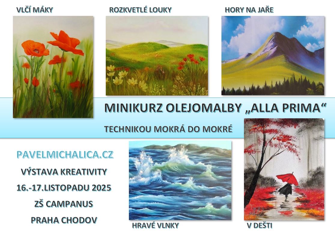 Podzimní Výstava kreativity nově proběhne v ZŠ Campanus na Chodově ve dnech 15.-17.listopadu 2025 , ale olejomalba bude tentokrát jen v neděli 16.11. a v pondělí 17.11.2025